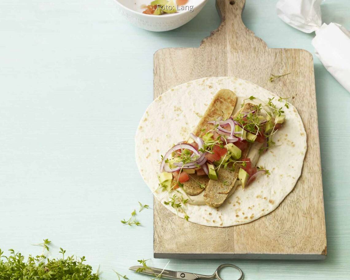 Die Tortillas nacheinander in der Pfanne erwärmen, sodass sie elastisch werden, dann auf die Arbeitsfläche legen. Sesamcreme jeweils als länglichen Streifen in der Mitte der Tortillas verteilen. Würstchenscheiben und die Avocado-Tomaten-Mischung daraufgeben. Die Kresse vom Beet schneiden und darüberstreuen.