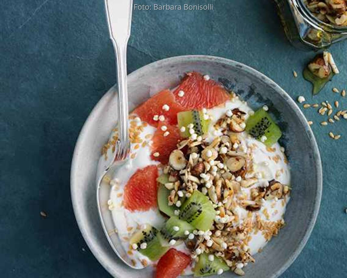 Die Grapefruit samt weißer Haut mit einem scharfen Messer dick schälen und die Fruchtfilets zwischen den weißen Trennhäutchen herausschneiden. Grapefruitfilets in mundgerechte Stücke schneiden. Kiwi schälen und würfeln. Den Quark mit der sauren Sahne glatt rühren, die Leinsamen unterrühren.