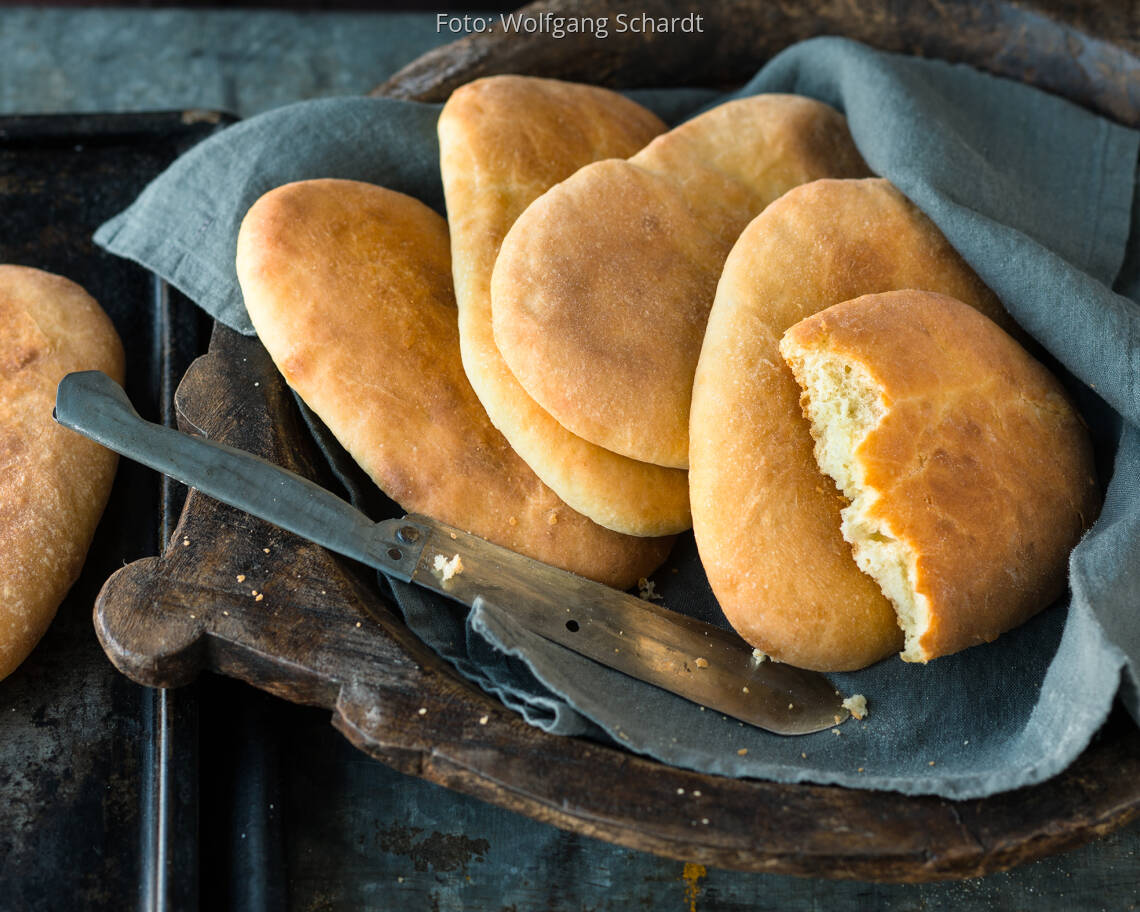 Inzwischen den Backofen auf 250° vorheizen. Die Fladen mit der restlichen Butter einpinseln und blechweise nacheinander im Ofen (Mitte) jeweils ca. 3 ½ Min. backen, dann die Brote wenden und in ca. 3 ½ Min. fertig backen, bis sie leicht braun sind. Aus dem Ofen nehmen, sofort in ein sauberes Tuch wickeln und bis zum Servieren darin aufbewahren.