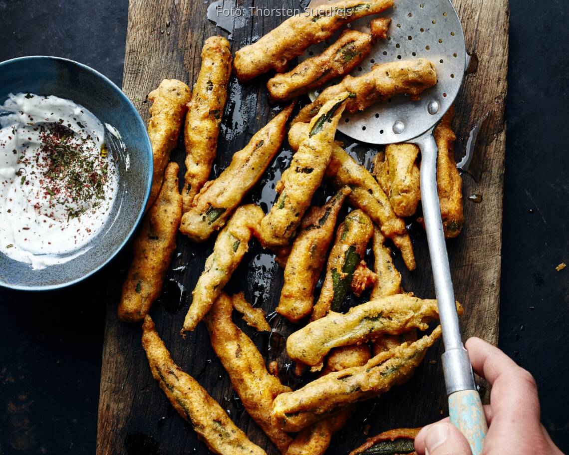 Die Schoten schmecken besonders lecker, wenn man sie in Zitronenjoghurt dippt: Dafür 1 EL Zitronensaft mit 150 g Sahnejoghurt (10 %) verrühren, mit 1 TL Sumach, Salz, Pfeffer und ½ TL getrockneter Minze würzen.