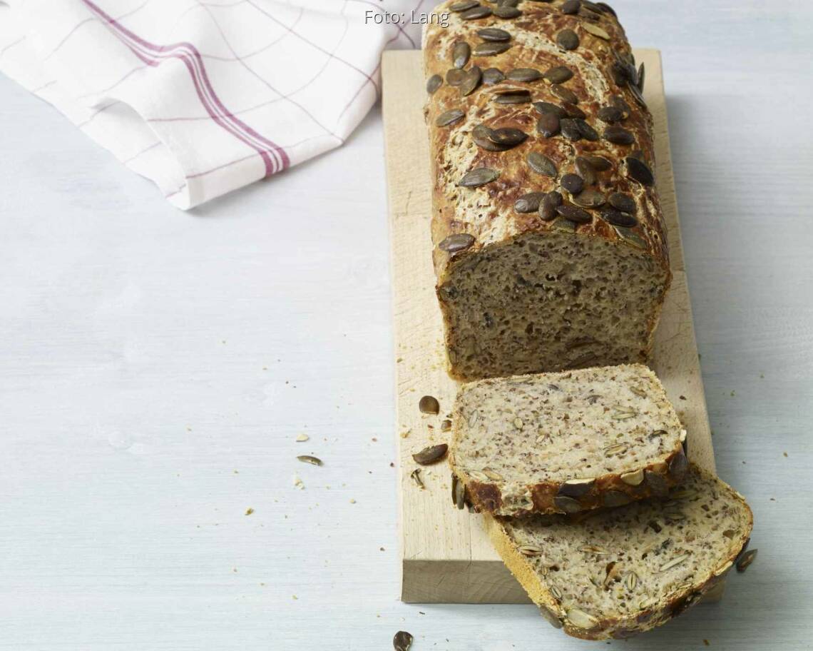 Dann den Backofen auf 200° vorheizen, auf den Ofenboden eine kleine Schüssel mit Wasser stellen. Den Teig mit dem restlichen Joghurt bestreichen und mit den übrigen Kürbiskernen bestreuen. Im Ofen (Mitte) ca. 50 Min. backen, bis das Brot eine schöne Kruste bekommen hat.