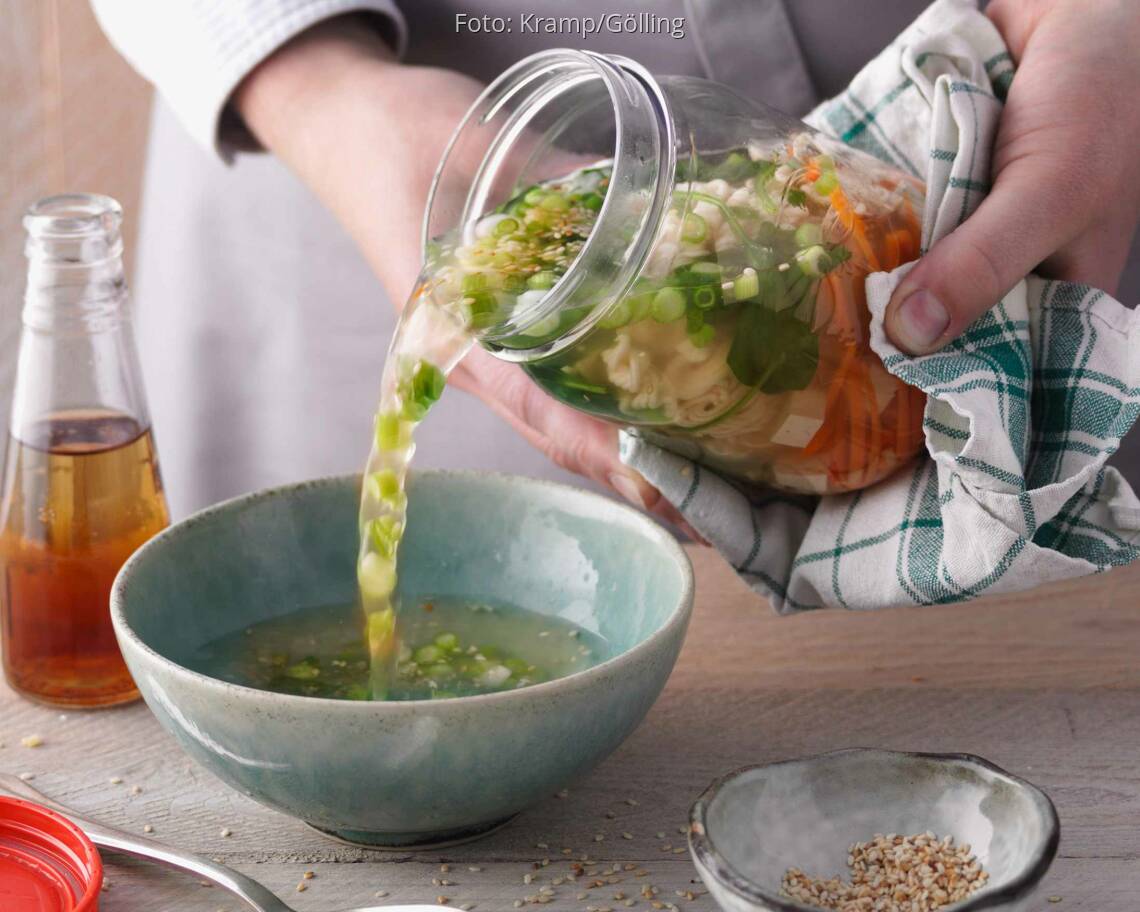 Wer die Möhren- und Frühlingszwiebelstücke nicht ganz so knackig mag, brät sie vorher einfach in einer Pfanne in ca. 2 TL Öl 1–2 Min. an. Alternativ kann man das Gemüse in der Mikrowelle bei 600 Watt ca. 1 Min. erhitzen, bevor es mit den übrigen Zutaten wie beschrieben in das Glas kommt.