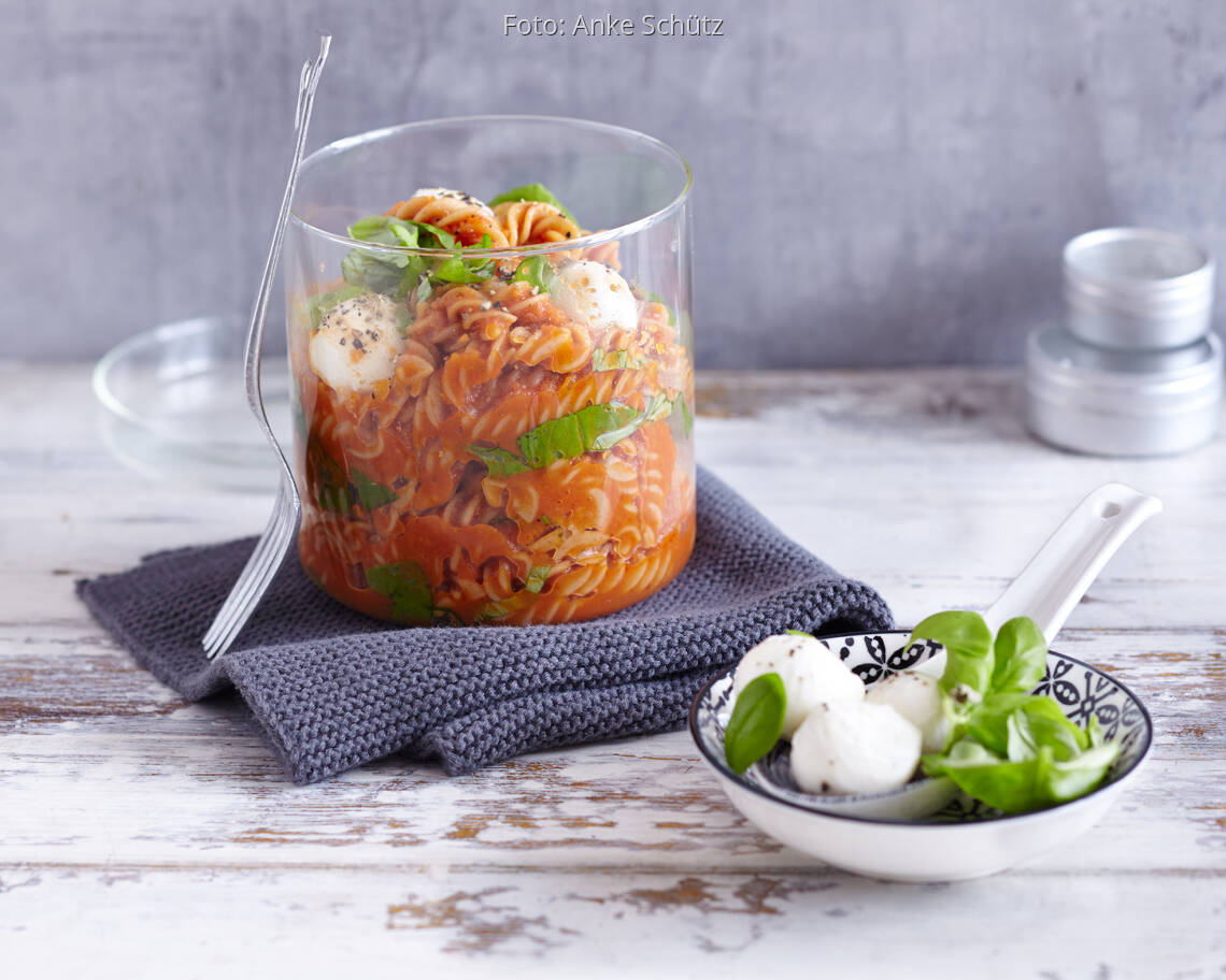 Die Nudeln in Salzwasser ca. 2 Min. kürzer als auf der Packung angegeben garen. Die Nudeln abgießen, kalt abschrecken und abtropfen lassen. Den Mozzarella abtropfen lassen, halbieren und in einem gut schließenden Behälter kalt stellen.