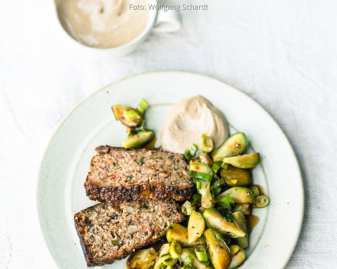 Den Nussbraten aus dem Ofen nehmen, 5 Min. ruhen lassen, dann auf ein Brett stürzen. Mit einem scharfen Messer in Scheiben schneiden. Mit dem Rosenkohl und dem Dip auf Tellern anrichten.