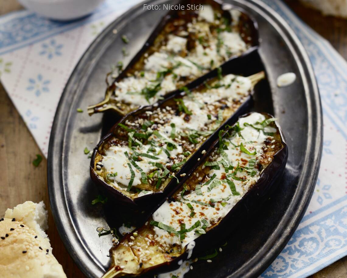 vegetarisches Rezept von Nicole StichEin Gericht aus der Kategorie „wenig Aufwand, wenig Zutaten“ – und große Augen bei den Gästen. So simpel die Zubereitung ist, so fantastisch schmecken diese ofengerösteten Auberginen, die man nach einer guten halben Stunde aus dem Rohr holen kann.