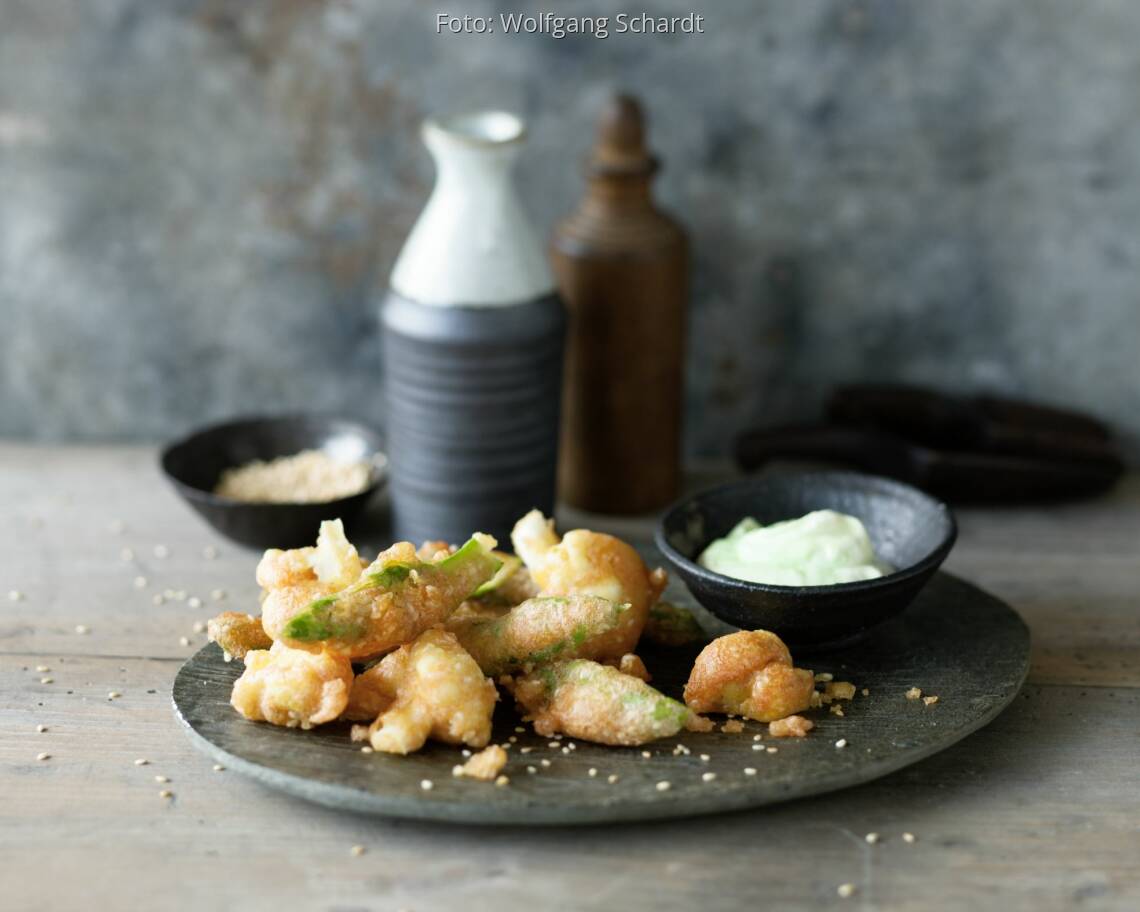 Schmand, Crème fraîche und Wasabi in einer Schüssel verrühren, salzen und zugedeckt kühl stellen. Gemüse putzen und waschen bzw. abreiben. Den Blumenkohl in Röschen teilen, den Spargel in Stücke schneiden, Pilze eventuell halbieren. Ingwer schälen und fein würfeln. Das Mehl mit Stärke, Backpulver, Kurkuma und Salz mischen. Mit einem Schneebesen so viel sehr kaltes Wasser unterrühren, dass ein dickflüssiger Teig entsteht (ca. 375 ml, für 4 Portionen). Sesam und Ingwer unterrühren.