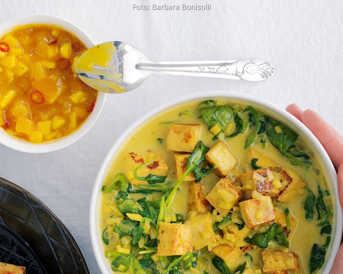 Die Kokosmilch angießen, mit Salz und Pfeffer würzen. Den Tofu auf den Spinat geben, alles noch 2–3 Min. köcheln lassen. Dazu schmecken Naan-Brot und Chutney.