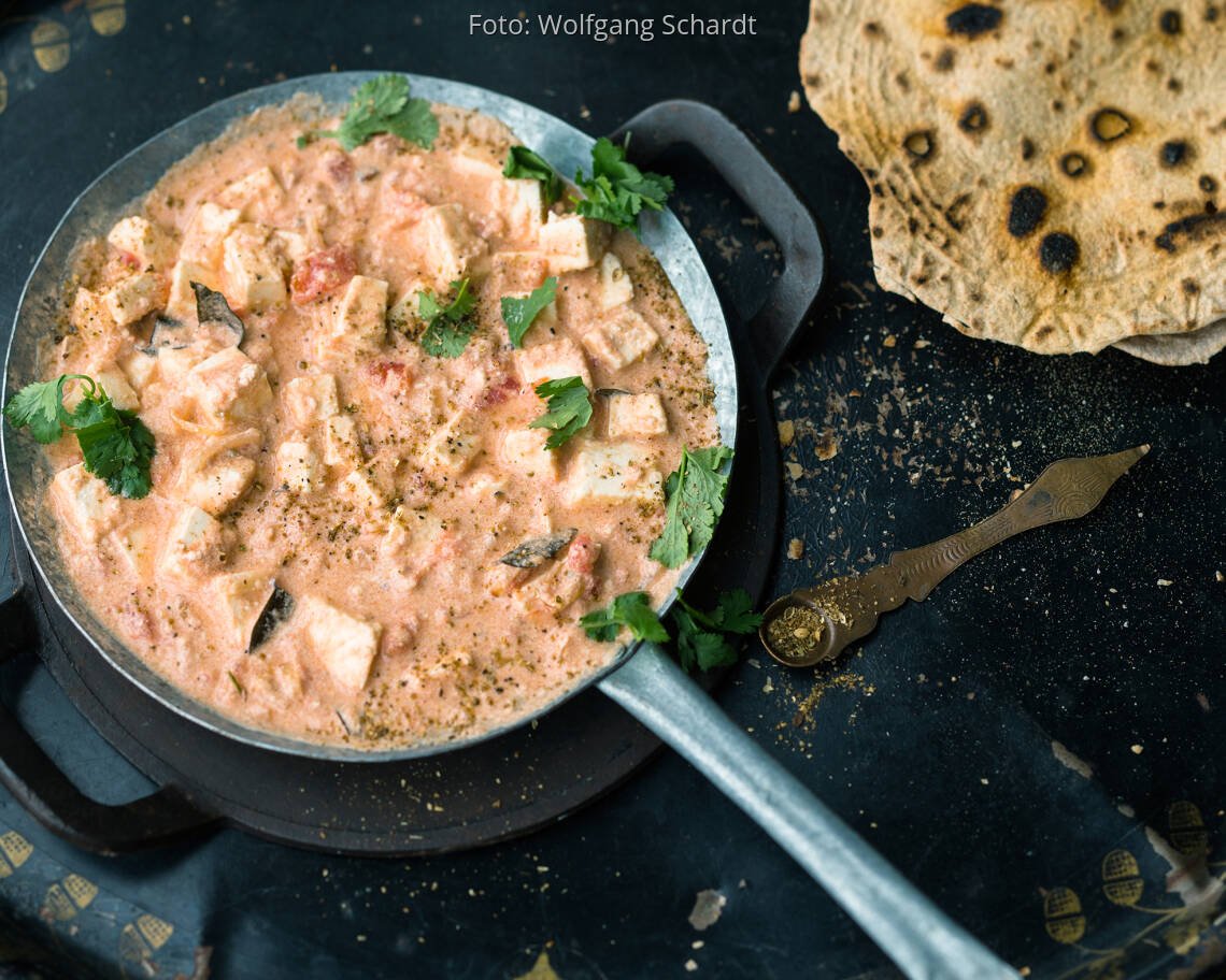 Inzwischen den Paneer in mundgerechte Würfel schneiden. Den Koriander waschen und trocken schütteln, die Blätter abzupfen und hacken. Paneer unter die Sauce rühren und kurz warm werden lassen. Mit Salz abschmecken und mit Koriander bestreuen. Dazu passen Naan-Brot und Garam Masala zum Bestreuen.