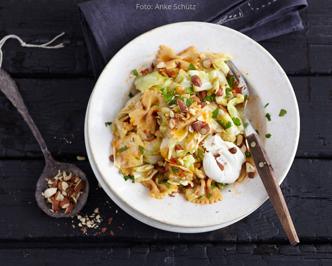 mit Vollkorn-Farfalle, Salz, Spitzkohl, Zwiebel