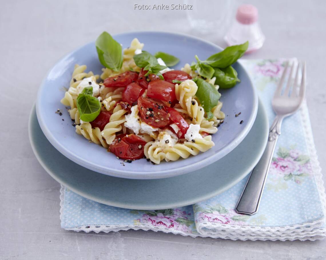 Den Ziegenkäse mit einer Gabel in kleine Stücke teilen. Die Nudeln abgießen, abtropfen lassen und in einer Schüssel mit den Tomaten und dem Käse mischen. Mit Basilikum bestreut servieren.
