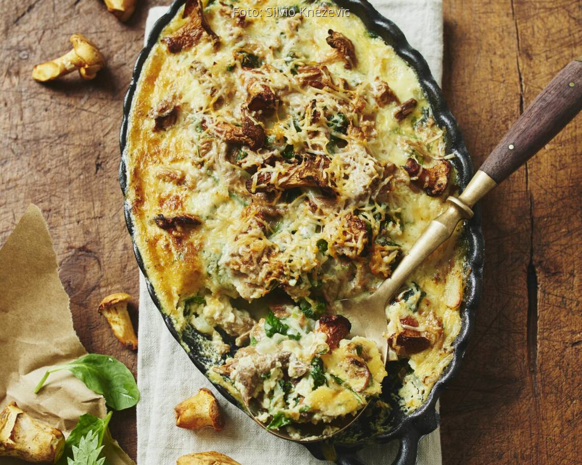 Eine flache Auflaufform mit der restlichen Butter einfetten, den Pfanneninhalt einfüllen. In einem kleinen Topf die Sahne und Milch erhitzen, Eier unterrühren, mit Salz, Pfeffer und Muskat würzen. Die Sauce über die Pilzmischung gießen, mit Parmesan bestreuen und im Ofen (Mitte) ca. 15 Min. backen, bis die Oberfläche eine schöne Kruste zeigt.