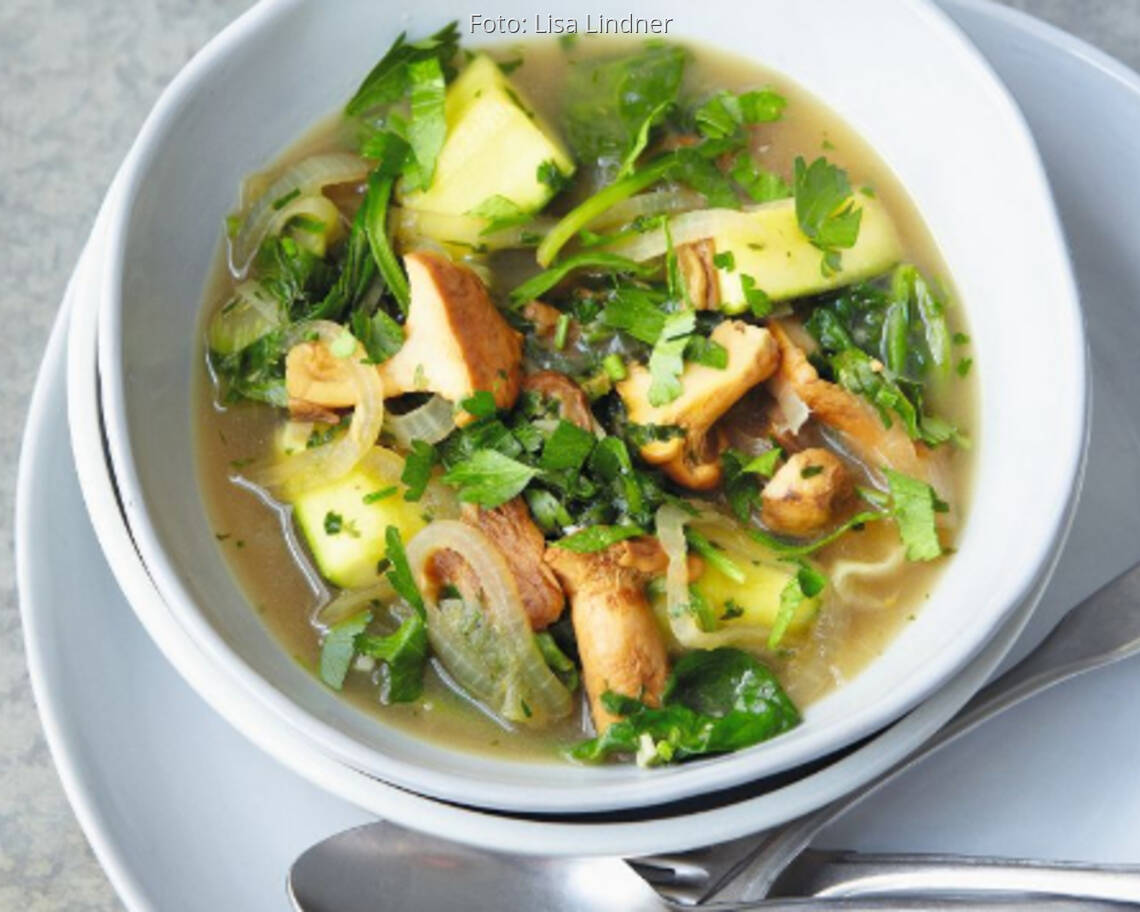 Die Steinpilze abgießen, dabei das Einweichwasser auffangen. Größere Pilze bei Bedarf in 1–2 cm große Stücke schneiden, in den Topf geben und weitere 3 Minuten mitdünsten. Die Zucchini, die Pfifferlinge und den Spinat vorsichtig unterrühren, dann das Einweichwasser der Steinpilze zugießen und 3–4 Minuten köcheln lassen, bis alles Gemüse weich ist.