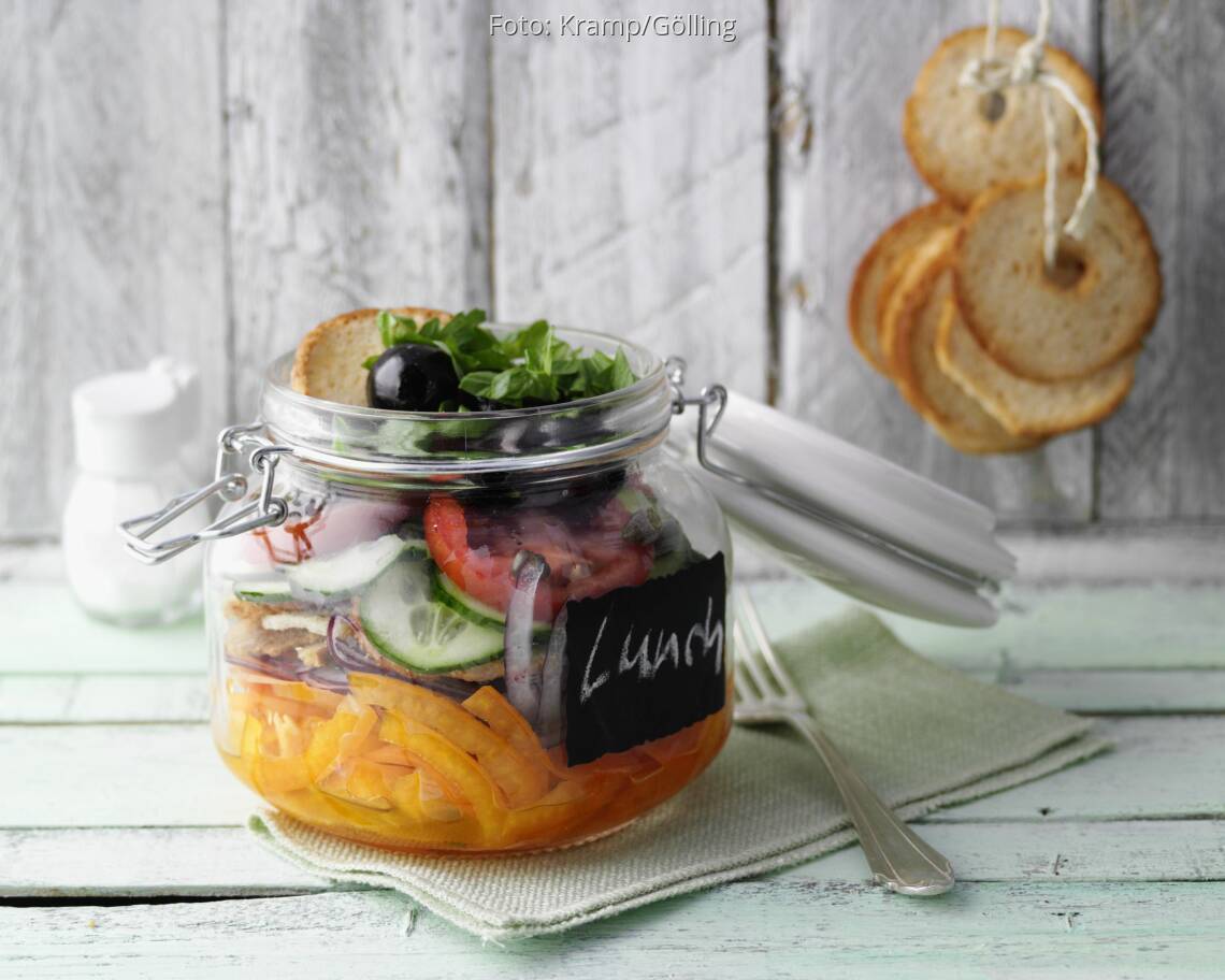 Zuerst die Vinaigrette in das Glas gießen. Dann nacheinander Paprika, Zwiebel und zwei Drittel der Brotchips darüberschichten. Darauf Gurke, Tomate und übrige Brotchips legen und mit Kapern, Oliven und Kräutern bestreuen. Das Glas verschließen und (über Nacht) in den Kühlschrank stellen. Zum Essen den Salat aus dem Glas auf einen Teller stürzen und locker mischen.