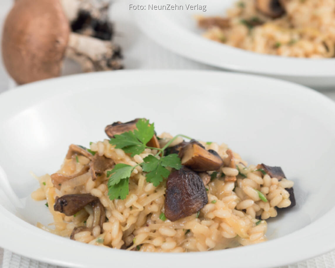 veganes Rezept von NeunZehn VerlagFür einen perfekten Risotto hat sich die Methode aus der Lombardei bewährt: Heiße Flüssigkeit wird langsam zum Reis gegeben und dabei stetig gerührt. Der Risotto ist fertig, wenn er eine cremige Konsistenz hat und trotzdem bissfest ist. Immer sofort servieren.