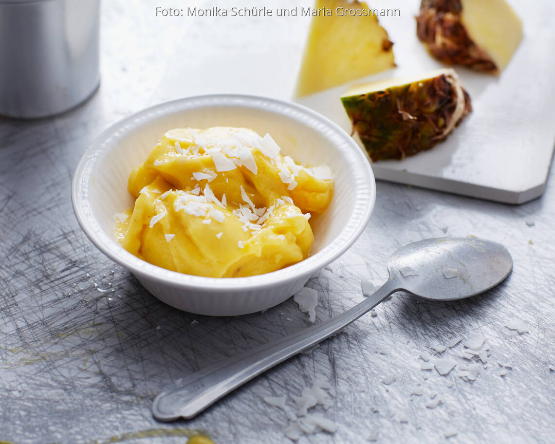 Am nächsten Tag die Ananas schälen, den harten Strunk in der Mitte herausschneiden und das Fruchtfleisch grob zerkleinern. Die Ananas mit den gefrorenen Bananen- und Mangostücken in den Mixer geben. Das Kokoswasser und das Kokosöl dazugeben. Alle Zutaten auf höchster Stufe mixen, bis die Mischung die Konsistenz von Eiscreme hat.