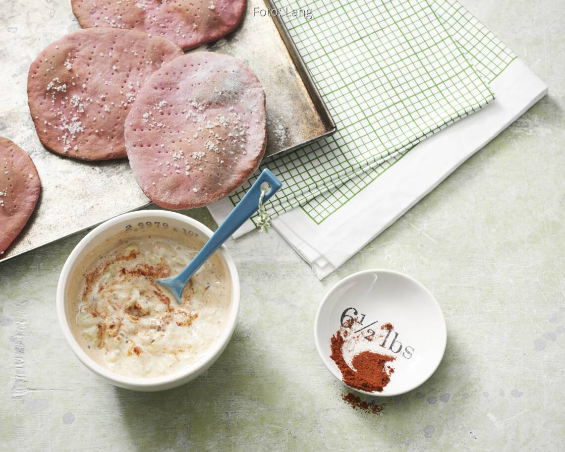 Die Gurken-Raïta vor dem Servieren mit Paprikapulver bestäuben. Das Pitabrot noch warm mit der Raïta genießen.