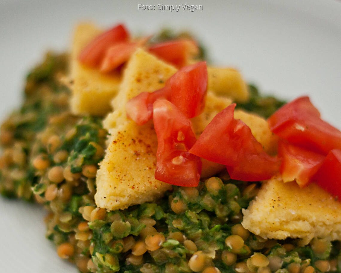 Foto: Simply VeganPolenta-Ecken auf roten Linsen mit Spinat