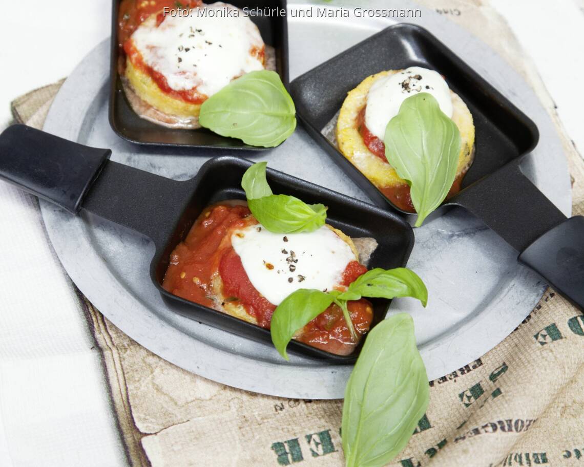 Mozzarella trocken tupfen und in Scheiben schneiden. Aus der Polenta Stücke in Größe der Raclettepfännchen schneiden oder mit einem Glas Kreise ausstechen. Die Polenta in die Pfännchen geben und etwas Tomatensauce darübergeben. Mit Mozzarella belegen und Pfeffer darübermahlen. Im heißen Gerät 3–5 Min. überbacken, bis der Käse geschmolzen und leicht gebräunt ist.
