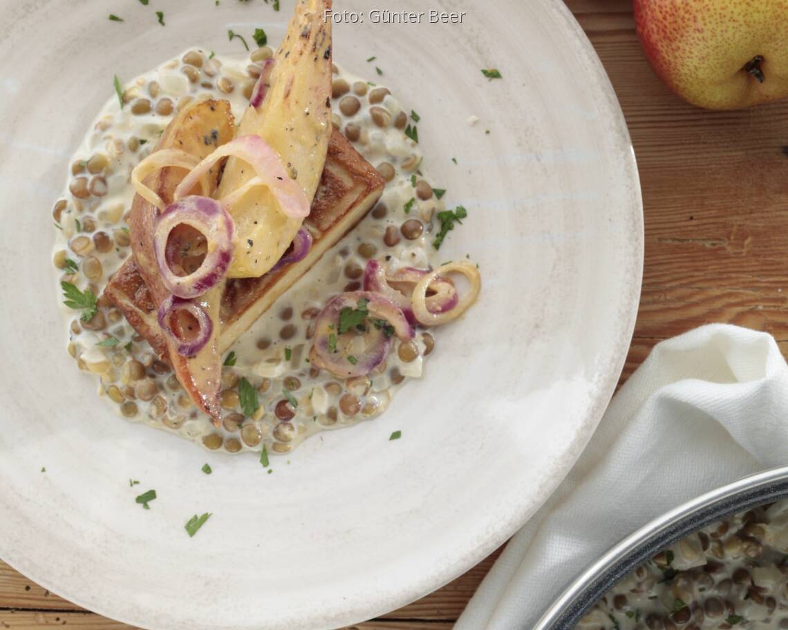 Foto: Günter BeerRäuchertofu mit Linsen und Zwiebel-Birnen
