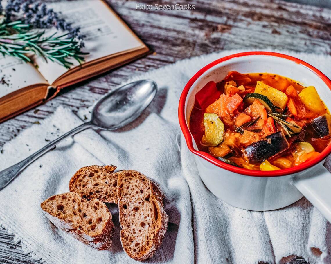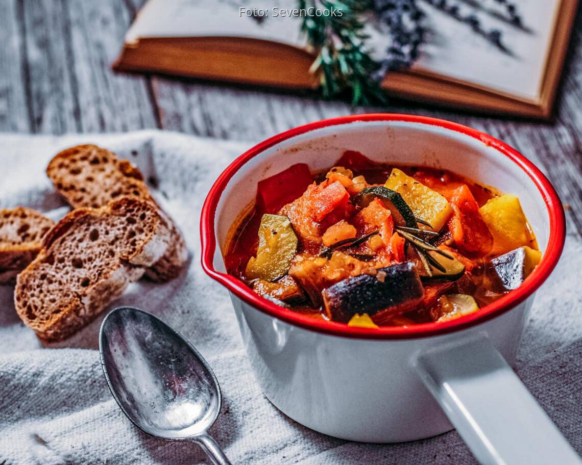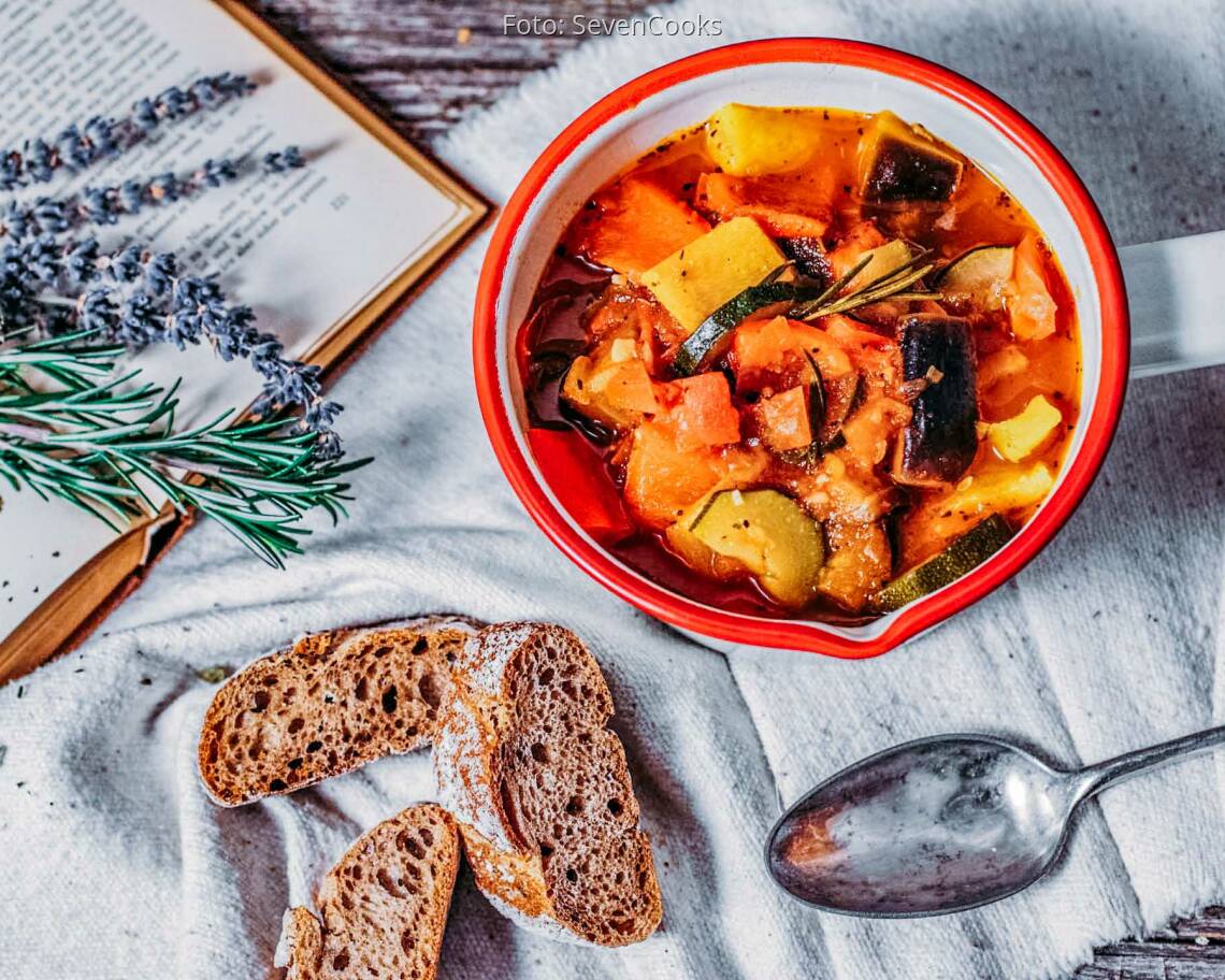 Die frischen Kräuterzweige hinzufügen und mit Salz und Pfeffer würzen. Mit Wasser ablöschen und 10 – 15 Minuten köcheln lassen. Am Ende die Kräuterzweige entfernen. Schmeckt sowohl heiß als auch kalt und besonders gut zu frischem Baguette! Rata – Touille!