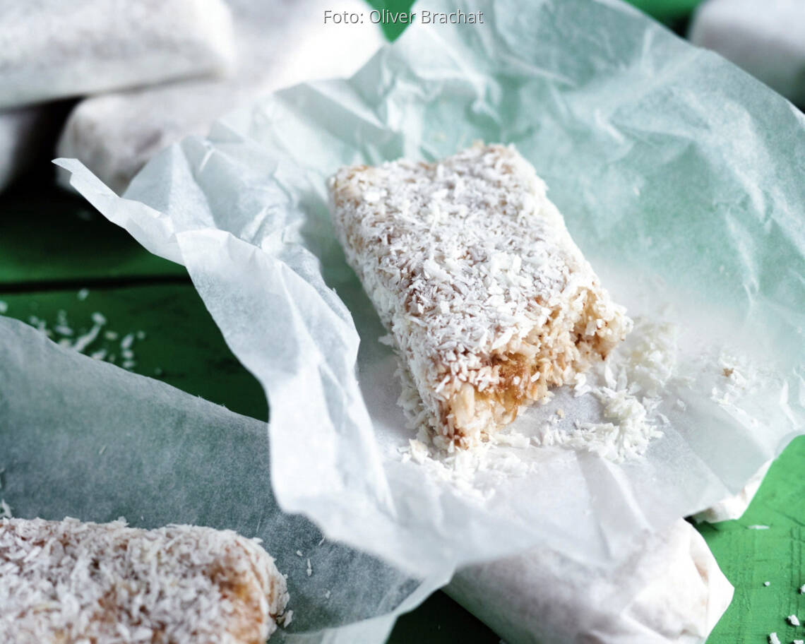 Die Kokosflocken leicht anrösten und alles mischen. Aus der Masse Stücke (bei 4 Portionen 8 Stück) formen (ca. 3 cm dick, 3 cm breit, 8 cm lang). In passend zurechtgeschnittene Backpapierblätter einwickeln und bis zum Verzehr kalt stellen.