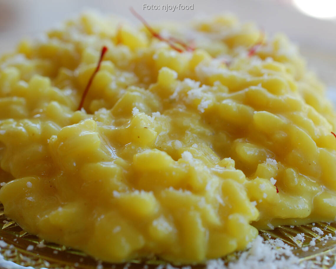 Risottoreis und Safran zu den Zwiebeln dazugeben, kurz anschwitzen und mit 1/3 der aufgekochten Brühe ablöschen. Den Risottoreis solange köcheln lassen bis die Brühe aufgesaugt ist. Den Vorgang solange wiederholen, bis die ganze Brühe aufgebraucht ist. Bitte immer wieder rühren, damit es nicht anbrennt!