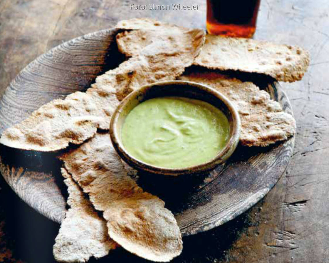 Dazu servieren Sie... - Minze-Bahnen-Dip: 400 g Cannellini- oder andere Bohnen aus der Dose, abgetropft und abgespült, mit ½ gepressten Knoblauchzehe, 2 EL gehackter Minze, 3 EL Rapsöl, 1 kräftigen Schuss Zitronensaft und etwas Salz und Pfeffer im Blitzhacker pürieren, dabei so viel Wasser hinzufügen, dass ein lockeres Püree entsteht (ca. 3 EL). Mit Zitronensaft, Salz und/oder Pfeffer abschmecken. - Einfache Guacamole