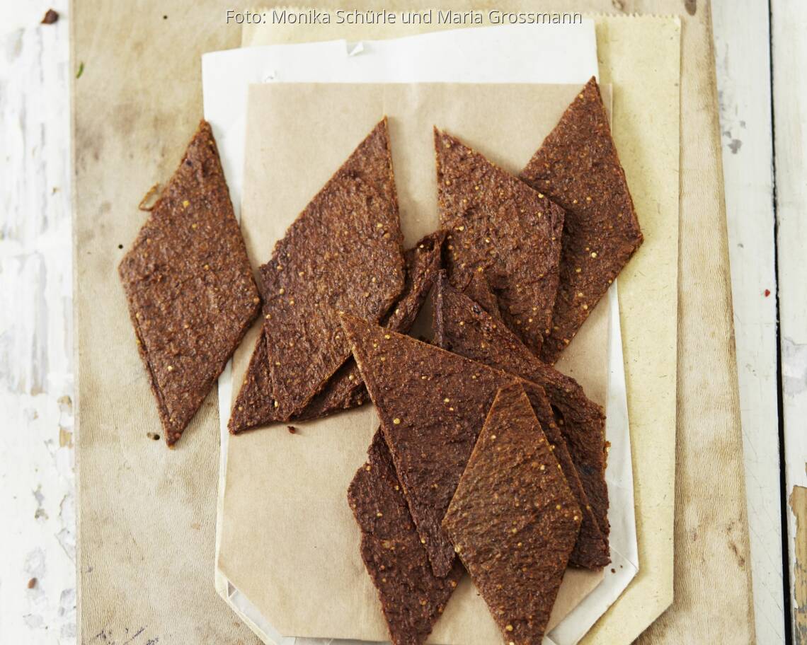 Für das Trocknen im Dörrgerät Backpapier so ausschneiden, dass sie auf die Siebe des Geräts passen, am Rand etwas Platz frei lassen. Teig daraufstreichen, ausrollen und bei 40° ca. 24 Std. trocknen. Jeweils nach der Hälfte der Zeit die Brote wenden und das Backpapier abziehen. In Stücke brechen und luftdicht lagern.
