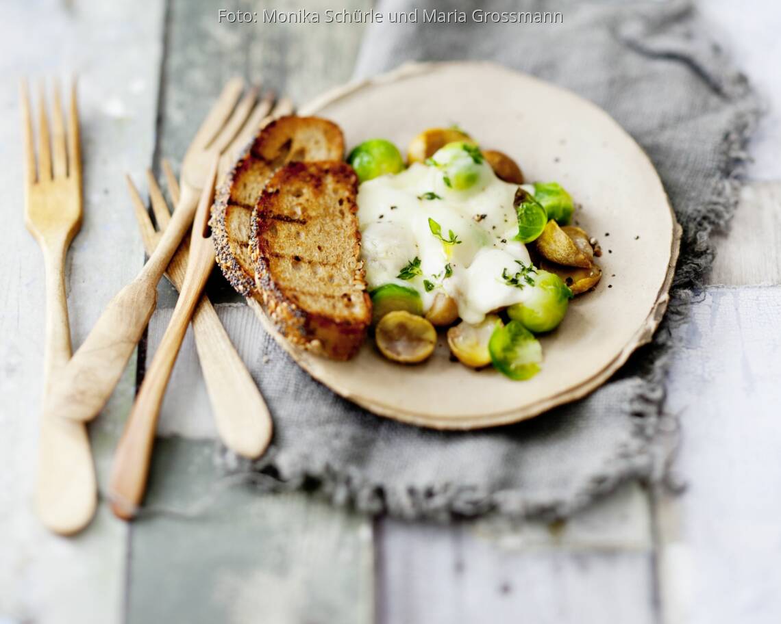 Den Rosenkohl jeweils halbieren (große Röschen vierteln) und mit den Maronen mischen. Die Rosenkohl-Maronen-Mischung in die Pfännchen geben und den Käse darauflegen. Im heißen Gerät überbacken, bis der Käse geschmolzen und leicht gebräunt ist. Mit Pfeffer und Muskatnuss würzen.