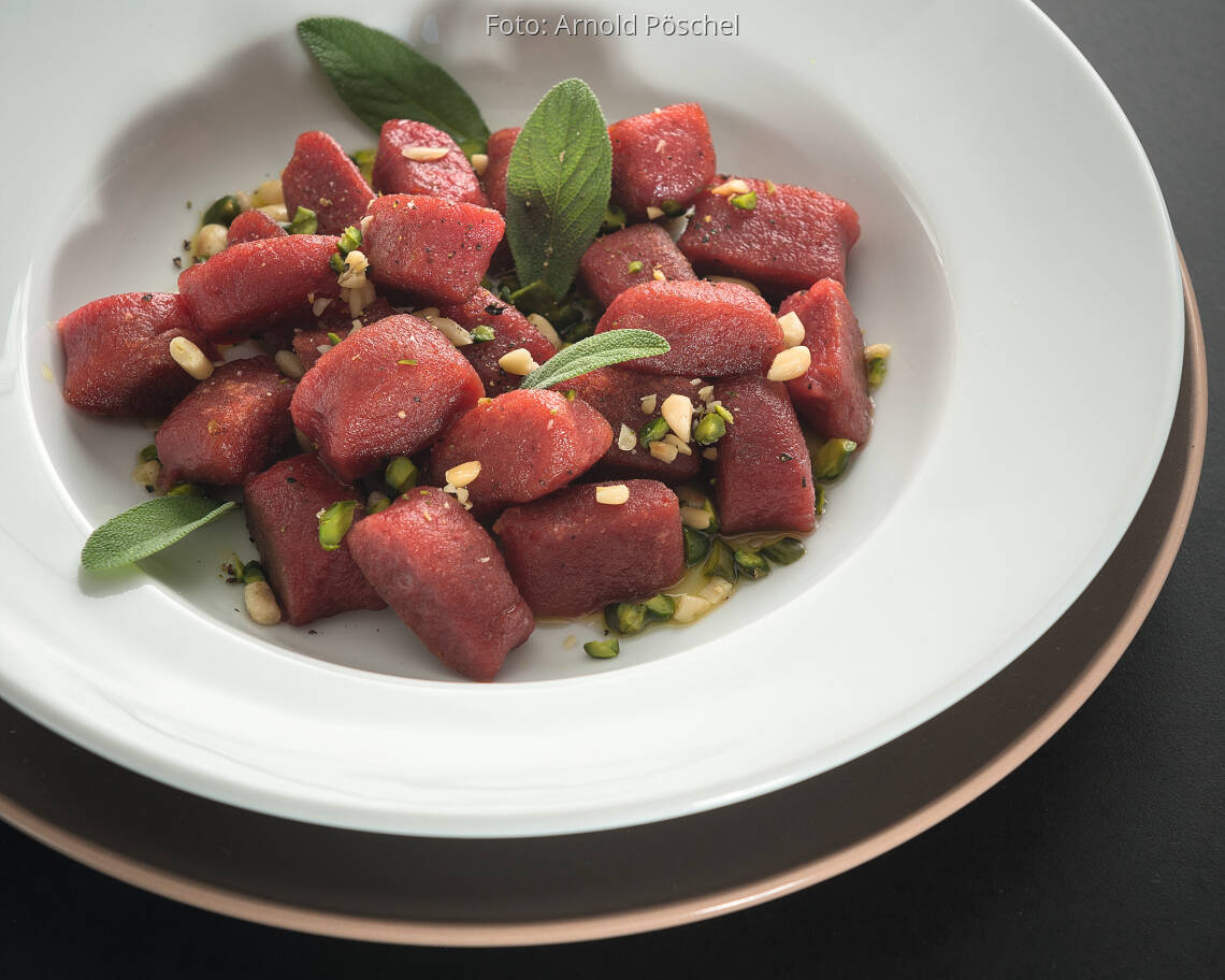 Foto: Arnold PöschelRote Bete-Gnocchi mit Salbeibutter, Pinienkernen und Pistazien