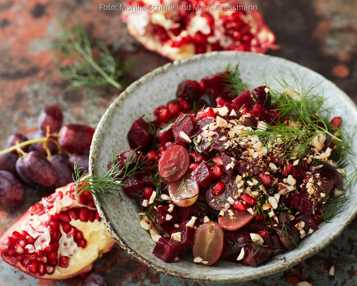 mit Rote Bete, Granatapfel, blaue Trauben, Dill