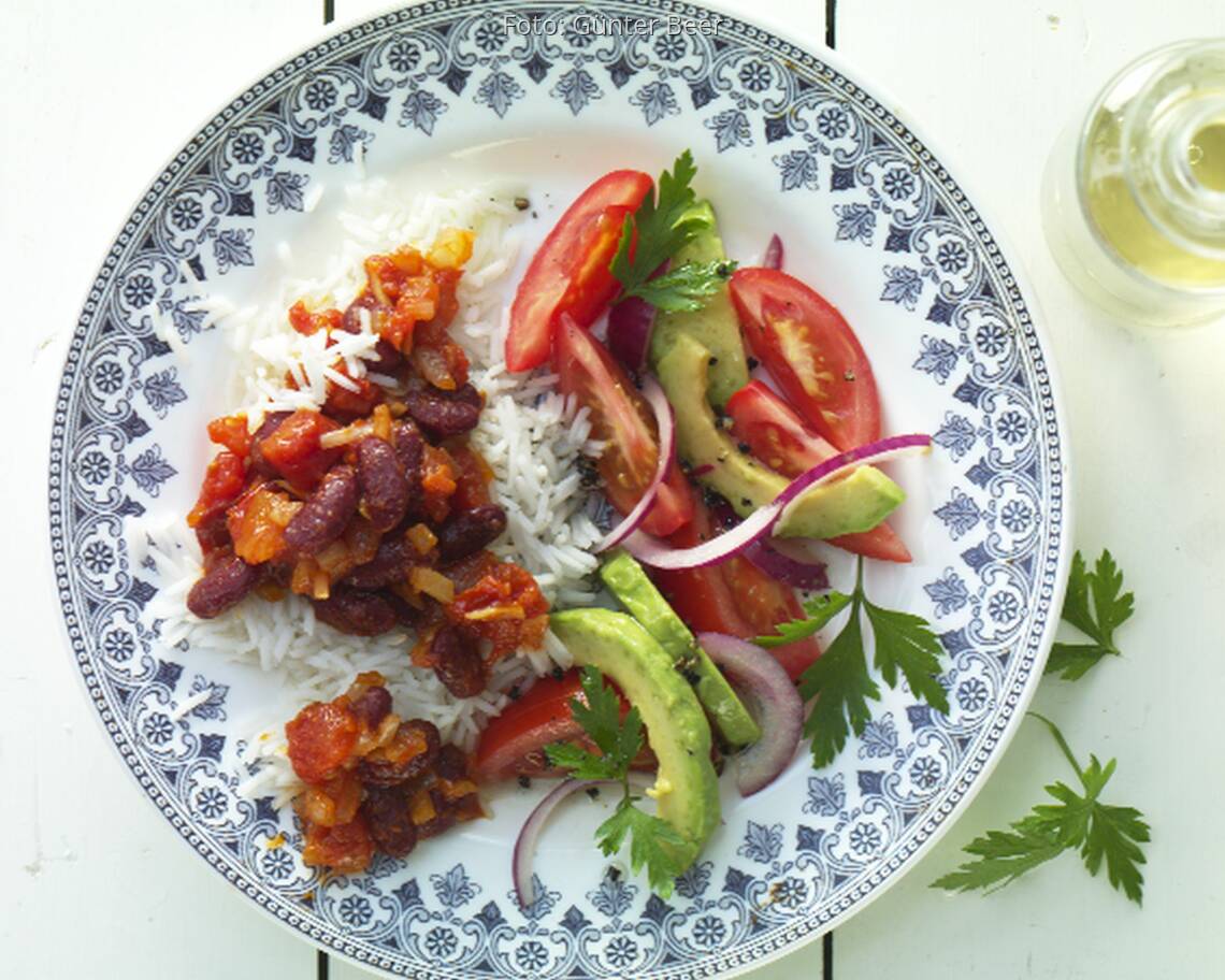 Den heißen Basmatireis mit den Bohnen und dem Tomaten-Avocado-Salat servieren.