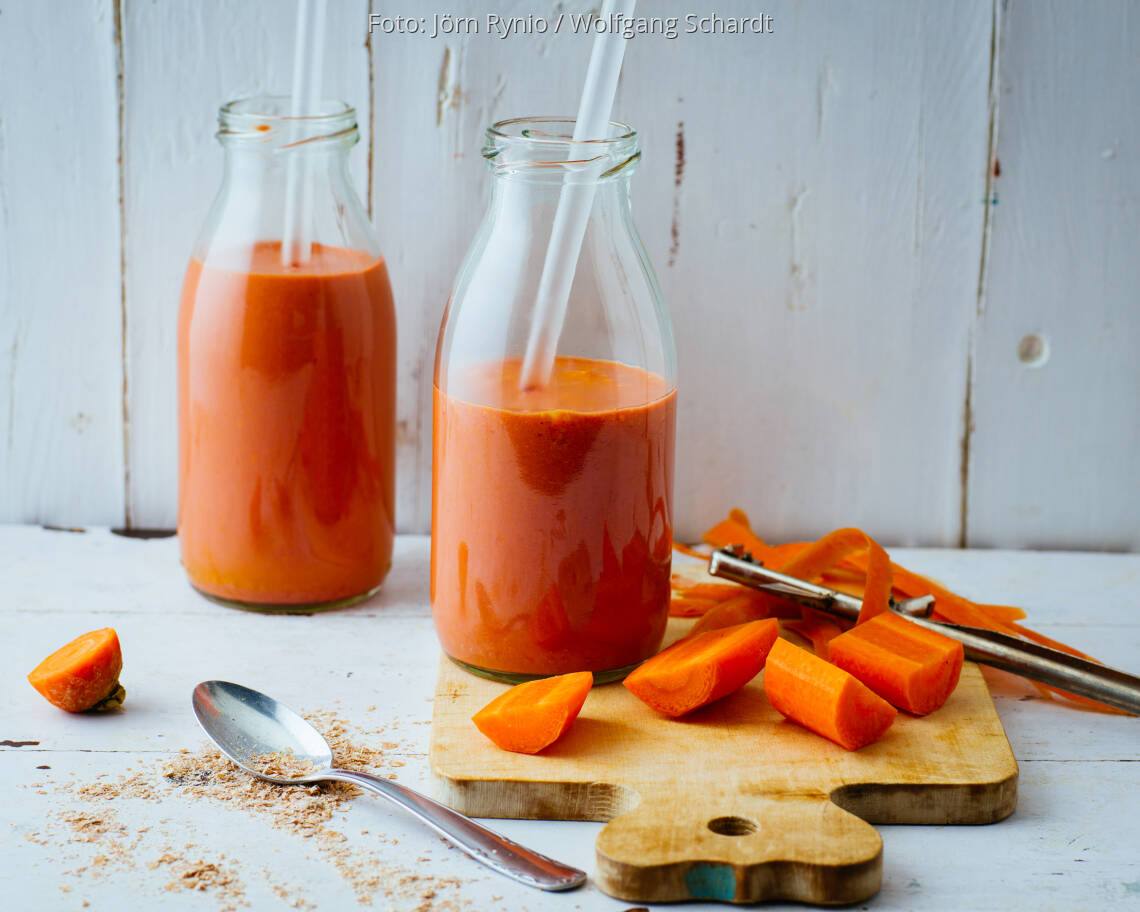 Die rote Möhren-Milch mit etwas Zitronensaft und – je nach Vorliebe – mit etwas Zucker abschmecken, dann in zwei hohe Gläser füllen und genießen.