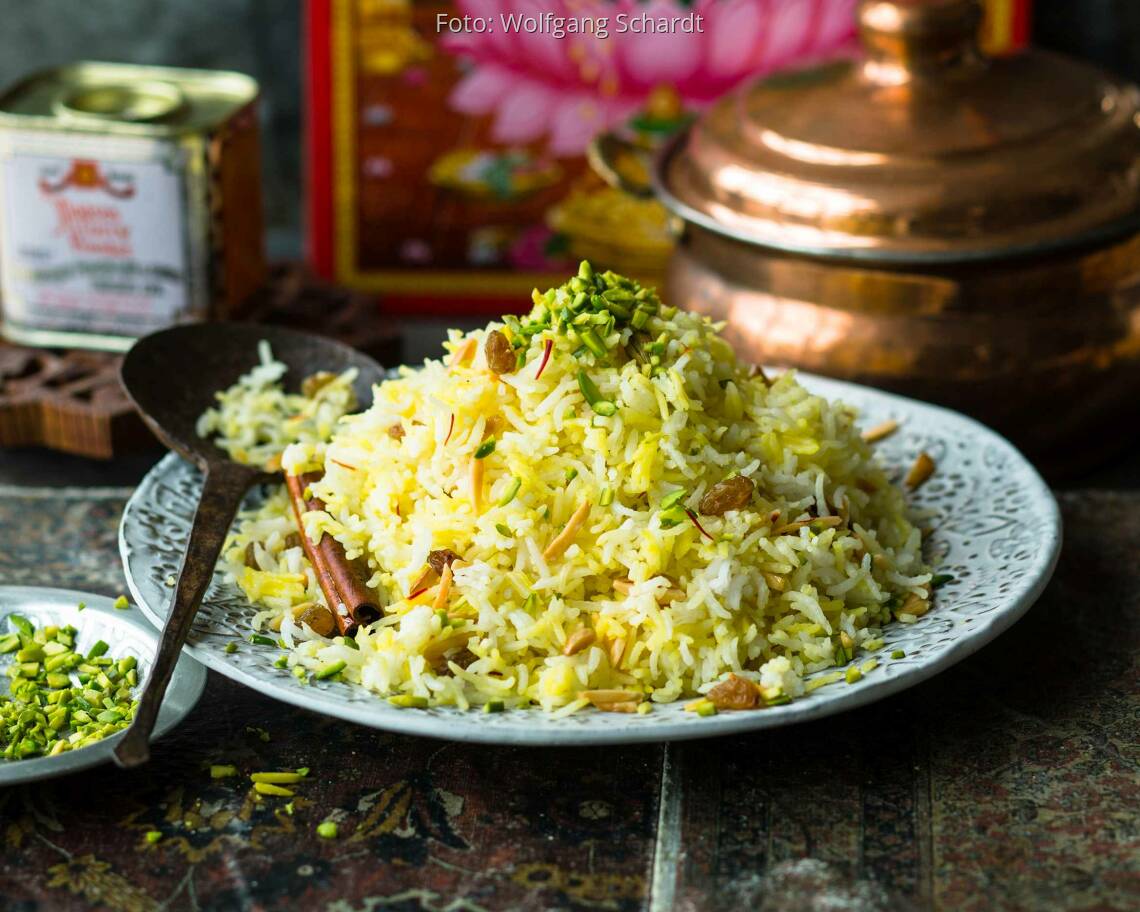 vegetarisches Rezept von Cornelia SchinharlFestlich aufgepeppt. Die Inder wissen, wie sie aus schlichtem Reis eine wahre Augen- und Gaumenweide zaubern: mit edlen Gewürzen und ein paar Extra-Zutaten wie Rosinen und Nüssen.