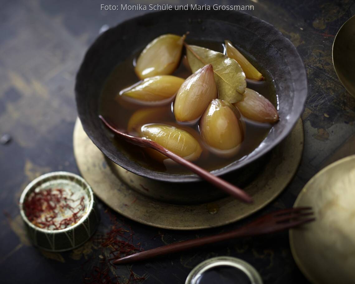 Die Safranfäden mit 2 EL heißem Wasser verrühren. Die Schalotten mit kochendem Wasser übergießen und ca. 5 Min. ziehen lassen. Dann kalt abschrecken und die Schale abziehen.