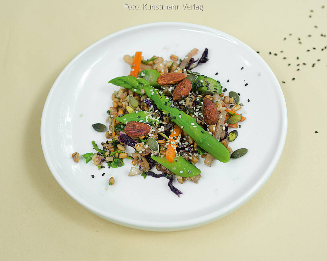 Foto: Kunstmann VerlagSaisonaler Gemüsesalat mit Getreide, Mandeln und Kürbiskernen