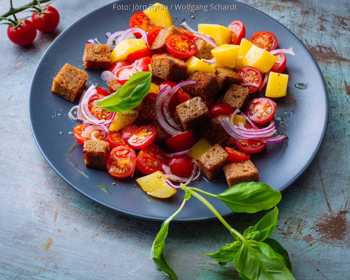 Essig, Öl, Salz und Pfeffer verrühren und mit Tomaten, Zwiebel und Kartoffeln mischen. Zum Schluss die Brotwürfel unterheben und den Salat mit Basilikumblättchen garniert servieren.