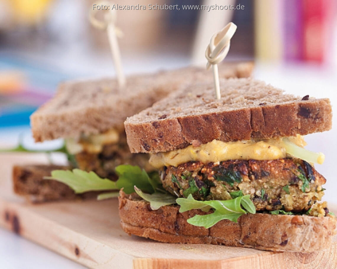Foto: Alexandra Schubert, www.myshoots.deSandwich mit Kartoffel-Pilz-Bratling mit süß-saurem Senfragout