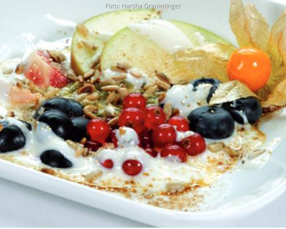 Foto: Harsha GrammingerSchnelles Pitta-Frühstück, frisches Obst auf Amaranth