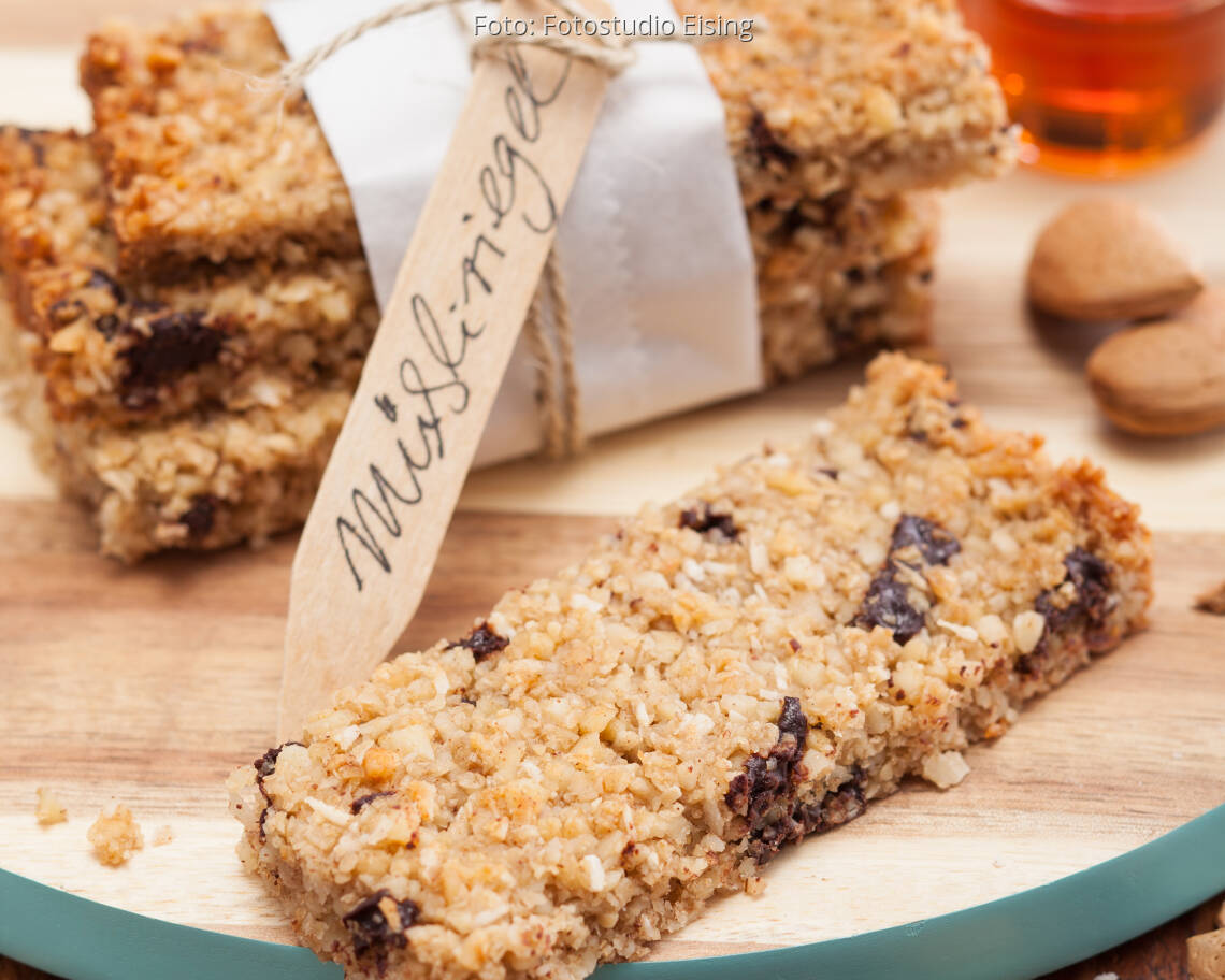Foto: Fotostudio EisingSchoko-Müsliriegel mit Mandeln