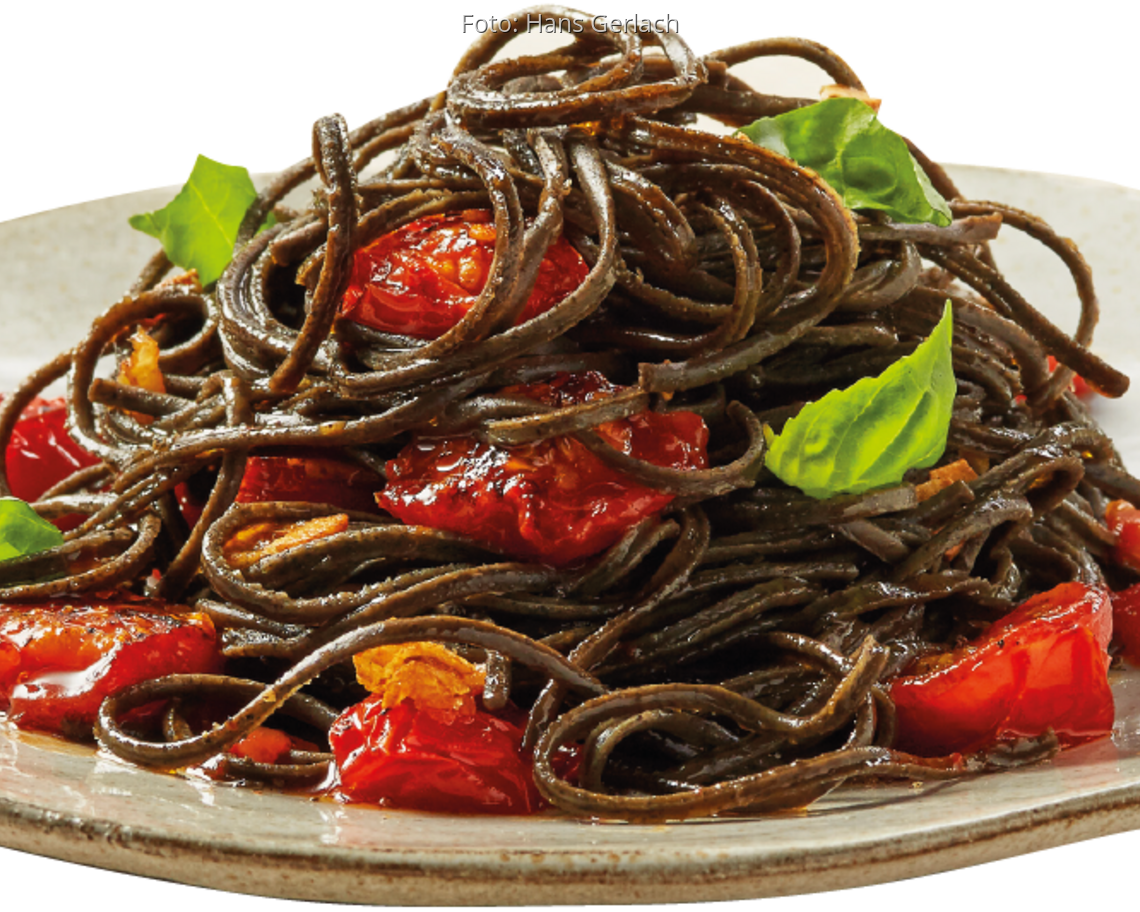 Foto: Hans GerlachSchwarze Bohnen Spaghetti mit gedünsteten Tomaten und Knoblauch
