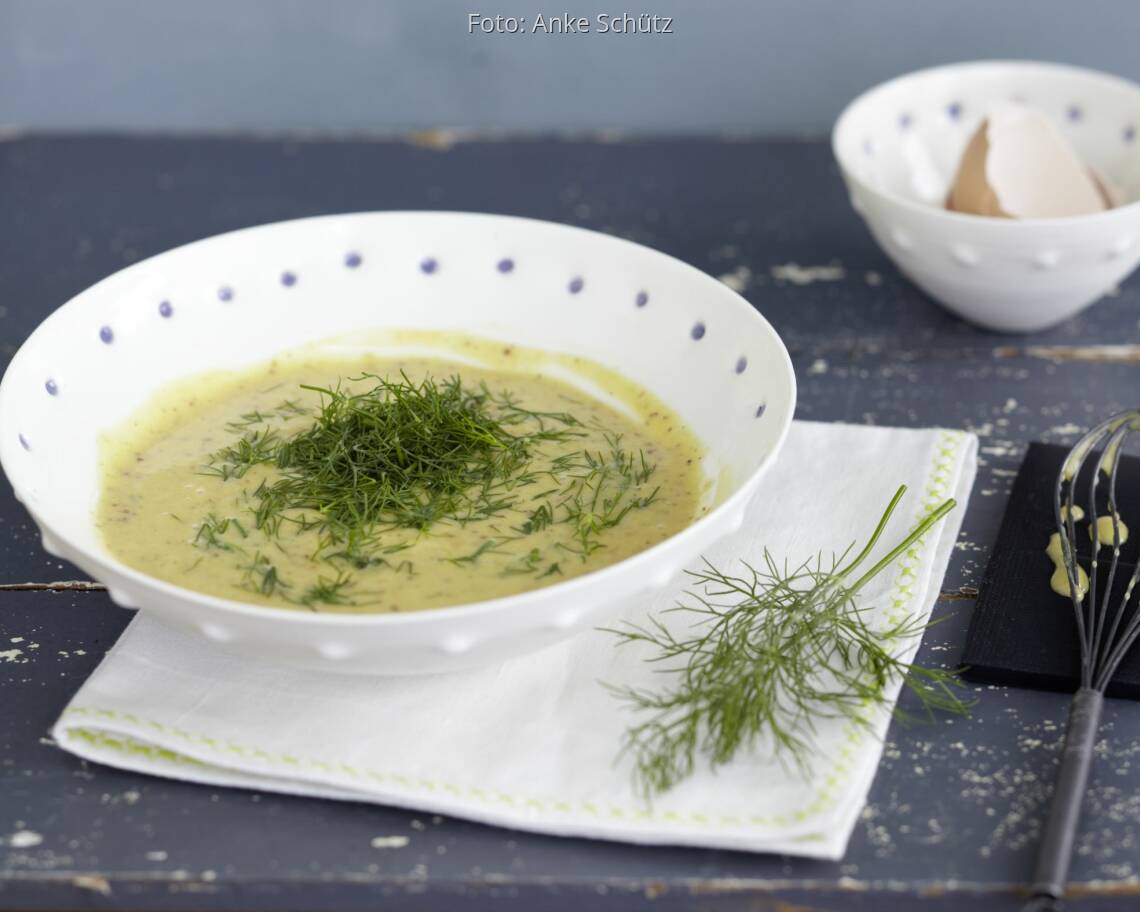 Dill waschen, trocken schütteln, die Spitzen abzupfen und fein hacken. Süßen Senf und Honig unter die Creme rühren und mit Zitronensaft und eventuell Salz und Pfeffer abschmecken, dann den Dill vorsichtig unterrühren.