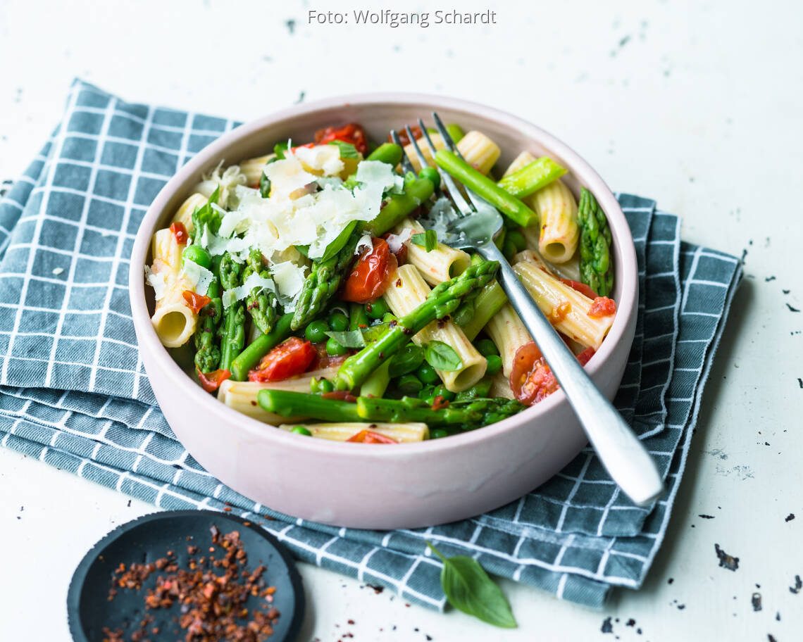 Dann die Nudeln offen bei mittlerer bis starker Hitze 10 Min. kochen lassen. Die Spargelspitzen unterheben und alles in weiteren 5–8 Min. fertig garen. Dabei ab und zu umrühren, je mehr Flüssigkeit verkocht ist, desto öfter. Die Nudeln probieren. Sind sie nicht durch, bei Bedarf noch 3–5 EL Wasser hinzufügen und kurz weiterköcheln lassen.