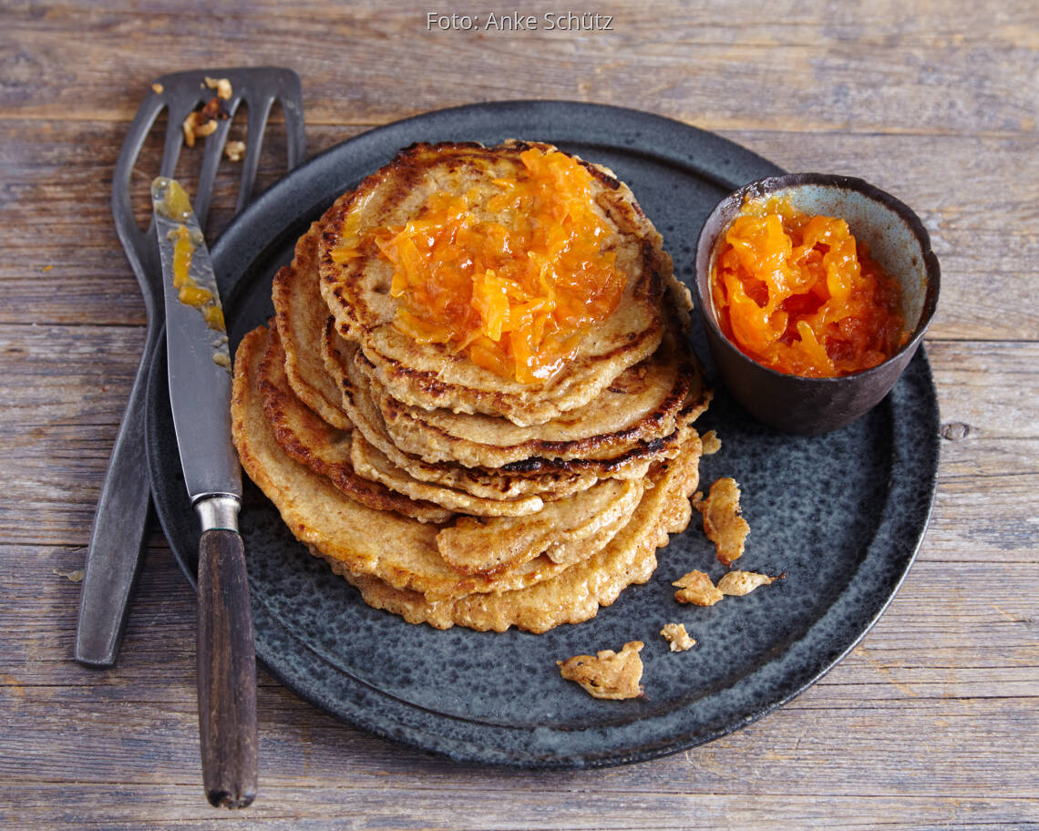 Möhrenkonfitüre: 500 g Möhrenraspel mit 3 EL frisch gepresstem Orangensaft, 250 g Gelierzucker 2 : 1 sowie 250 ml Wasser in einem Topf unter Rühren aufkochen. Ca. 12 Min. köcheln, dann abkühlen lassen.