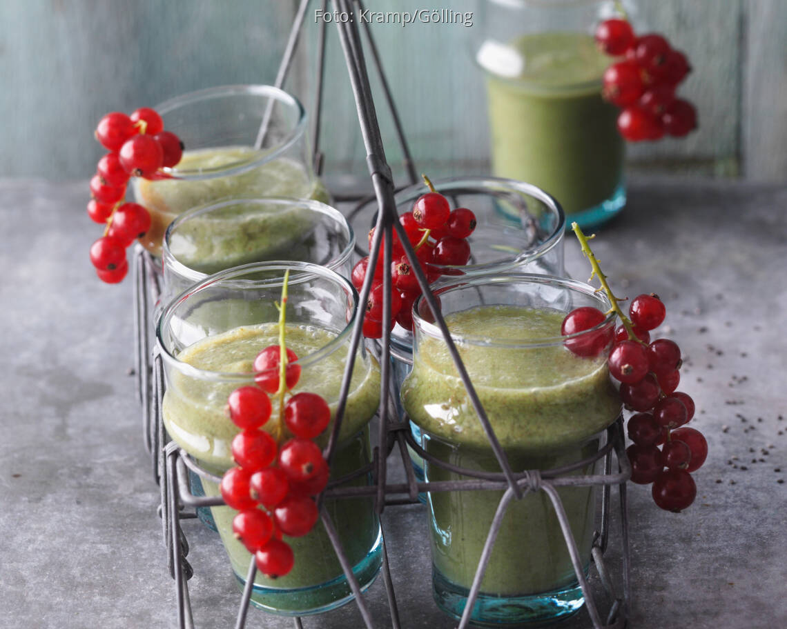 Den Smoothie in Gläser füllen. Die beiseitegelegten Johannisbeerrispen als Dekoration an den Glasrand hängen. Frisch und gut gelaunt genießen.