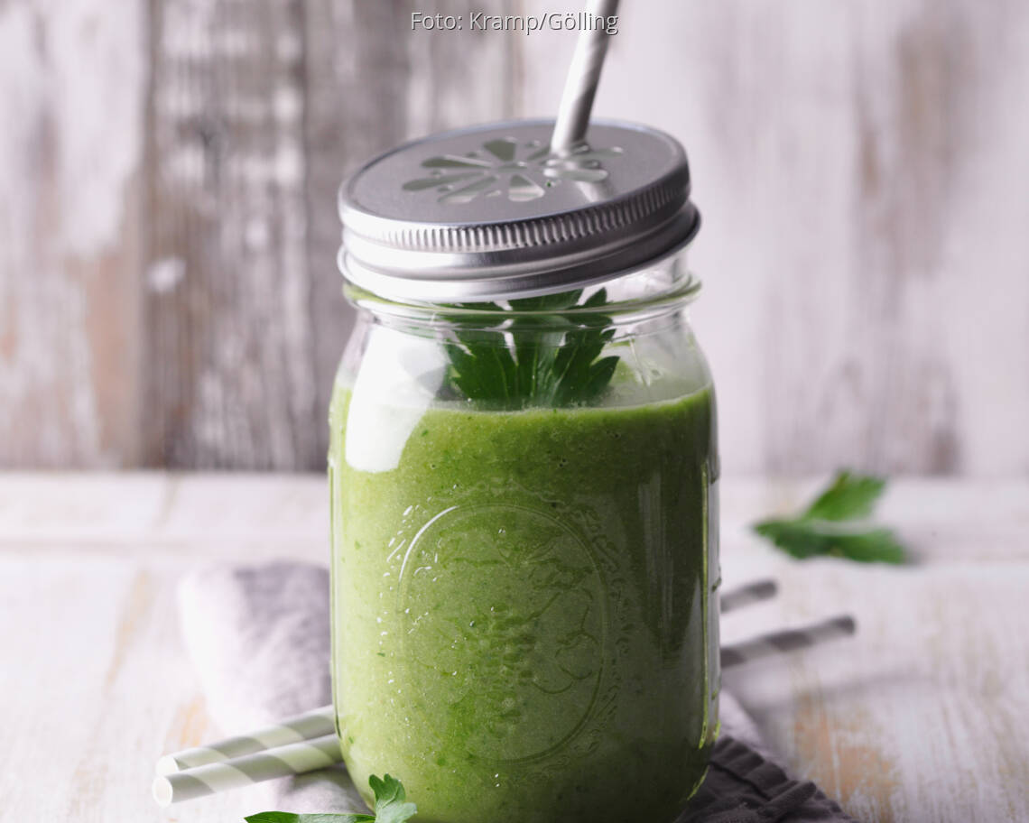 Foto: Kramp/GöllingSmoothie mit grünen Blättern, Avocado und Weizengras