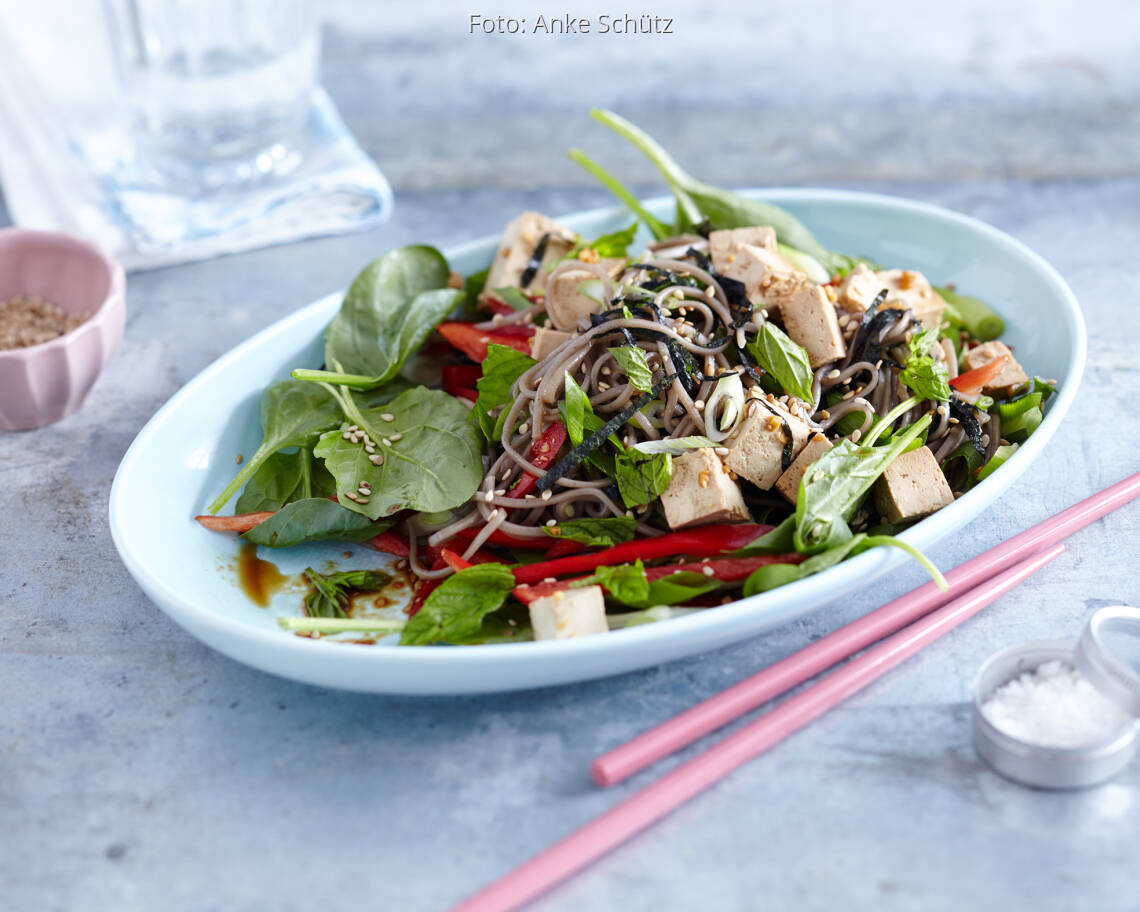 Die Sobanudeln nach Packungsanweisung in Salzwasser garen. Den Tofu in ein Sieb abgießen, dabei die Marinade auffangen und für das Dressing mit Sesamöl und Zitronensaft verrühren. Die Nudeln abgießen und abtropfen lassen, dann noch warm unter das Dressing mischen und etwas abkühlen lassen. Anschließend alle vorbereiteten Zutaten und die Sesamsamen unter die Sobanudeln mischen. Den Salat in einem gut schließenden Behälter bis zum Servieren kalt stellen.