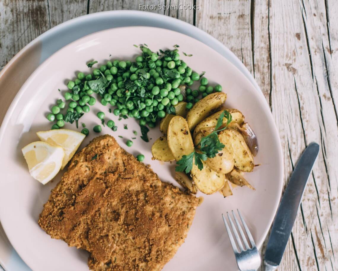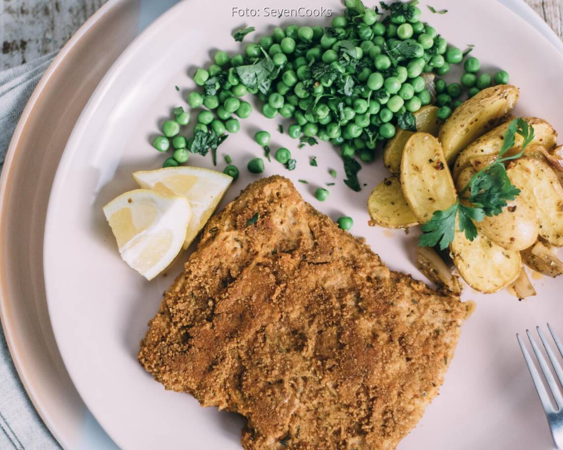 Foto: SevenCooksSojaschnitzel mit Babykartoffeln und Erbsen
