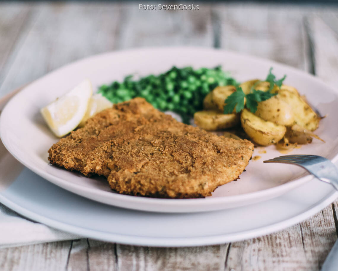 veganes Rezept von SevenCooks TraditionalNur weil du gerne tierische Produkte vermeidest, heißt das nicht, dass du auf ein leckeres kross gebratenes Schnitzel verzichten musst! Hier wird einfach ein Sojasteak mariniert und paniert. Es kommt dem originalen Wienerschnitzel ziemlich nahe und sieht optisch auch noch täuschend danach aus.
