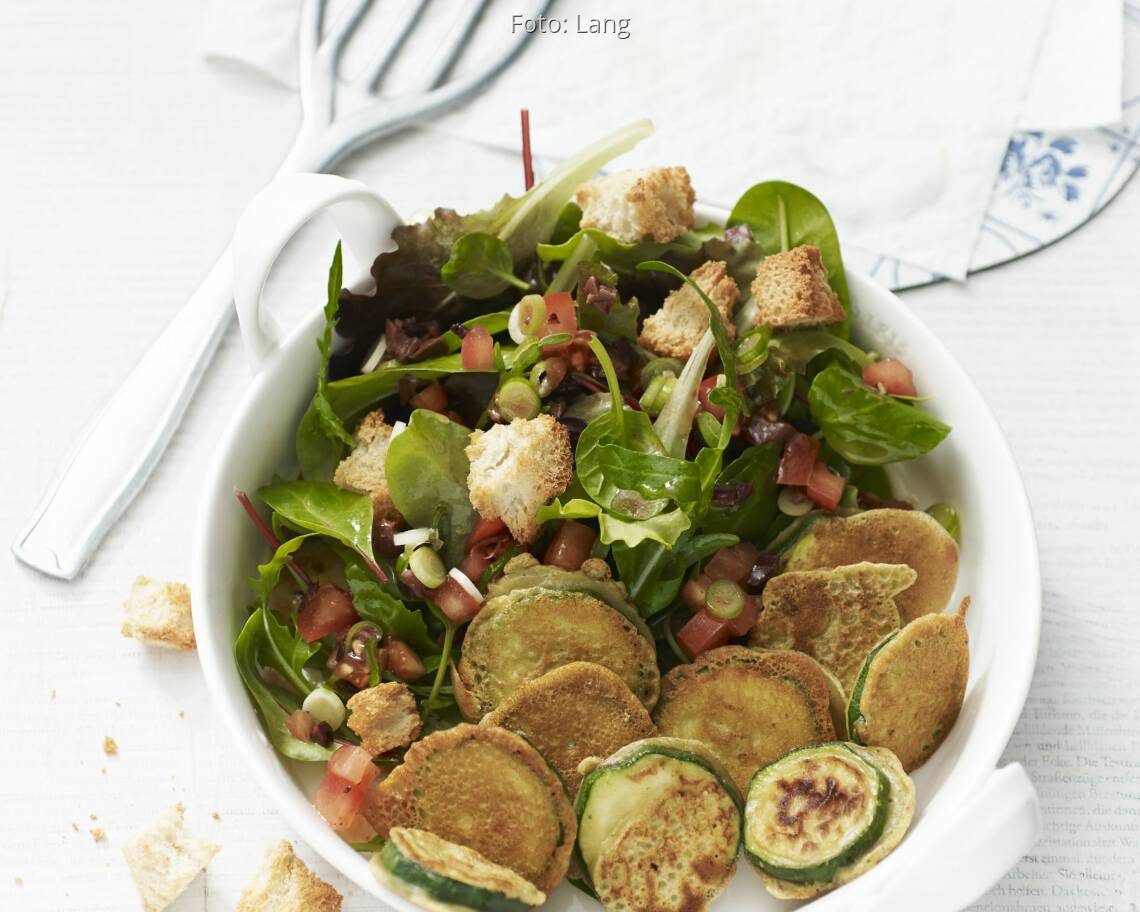 In einer Pfanne das übrige Öl erhitzen. Zucchinischeiben durch den Teig ziehen und von jeder Seite in ca. 3 Min. goldbraun braten. Dann herausnehmen, auf Küchenpapier abtropfen lassen und mit dem Salat anrichten. Die Tomaten-Vinaigrette darübergeben. Gehackte Oliven und geröstete Brotwürfel darauf verteilen.